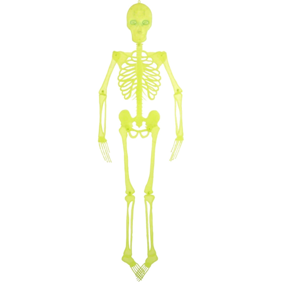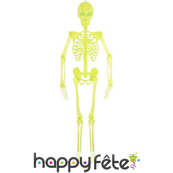 Squelette articulé phosphorescent de couleur jaune à suspendre. Au moment de passer la commande, vous pourrez choisir entre le modèle de 120 centimètres ou celui de 92 centimètres. Complétez votre décoration d'Halloween avec ce superbe squelette!