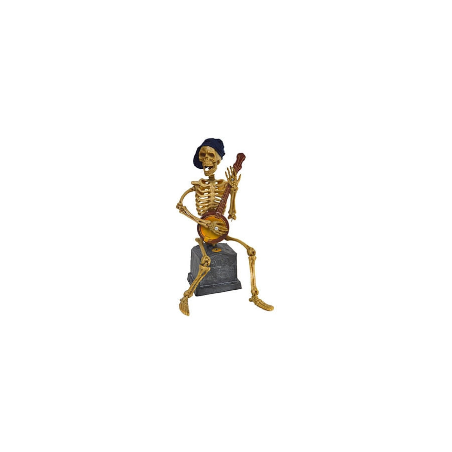 Il s'agit d'une décoration de 30 cm de haut, qui représente un squelette assis une pierre tombale, et jouant du banjo.