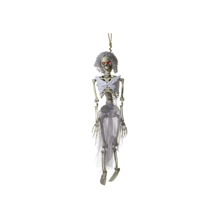 Si vous aspirez à faire en sorte que vos invités tremblent de peur, il vous faut le squelette mariée yeux lumineux à suspendre. Cette décoration pour halloween reprend un squelette de couleur blanche, virant au gris, habillé d'une robe de mariée blanche. Pour un effet encore plus réussi, la robe a été déchiquetée. Grâce à une batterie intégrée, cet objet déco bouge et émet des sons. Par ailleurs, ses yeux rouges s'allument également par la même occasion.