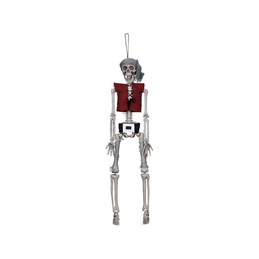 Pour une soirée sur le thème du sinistre, pour la fête du jour des Morts mexicain ou pour Halloween, vous provoquerez la peur avec ce squelette pirate articulé à suspendre de 40 cm de haut.