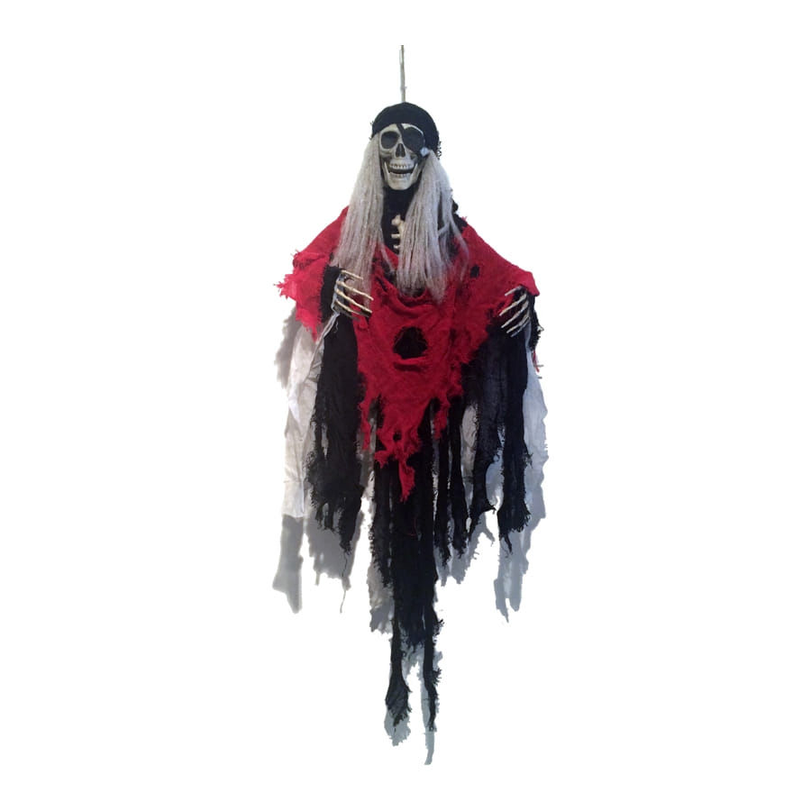Cette superbe décoration à suspendre représente un pirate squelette fantôme. Ce dernier possède des cheveux gris et est habillé de trois couches de tissus à effet déchiré : rouge, noir et gris. Un bandeau noir et un cache oeil assorti viennent l'orner. Cet article mesure 90 cm de hauteur. Il est à ne pas rater si vous voulez faire de votre maison une véritable maison hantée le soir d'Halloween ou pour d'autres occasions comme une soirée Pirate, une fête sur le thème de l'épouvante, ...