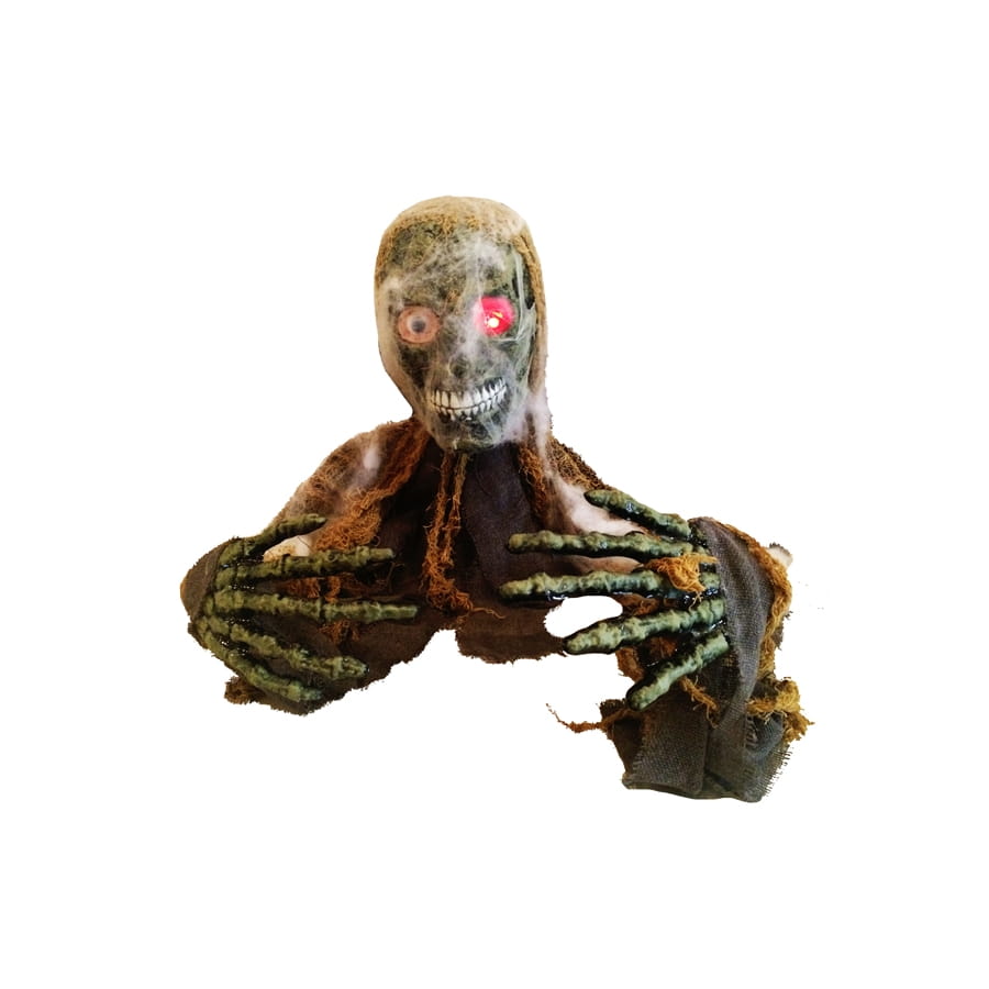 On a la frousse dès qu'on la voit cette statue de zombie sonore et mobile. Pourtant, ce n'est qu'une décoration d'Halloween que vous pourrez poser dans la maison. Elle est de couleur marron et mesure 120 cm. Plus qu'un simple zombie, celui-ci réagit au bruit, il ricane et a une tête et des bras qui bougent, grâce à 3 piles AAA que nous fournissons avec.