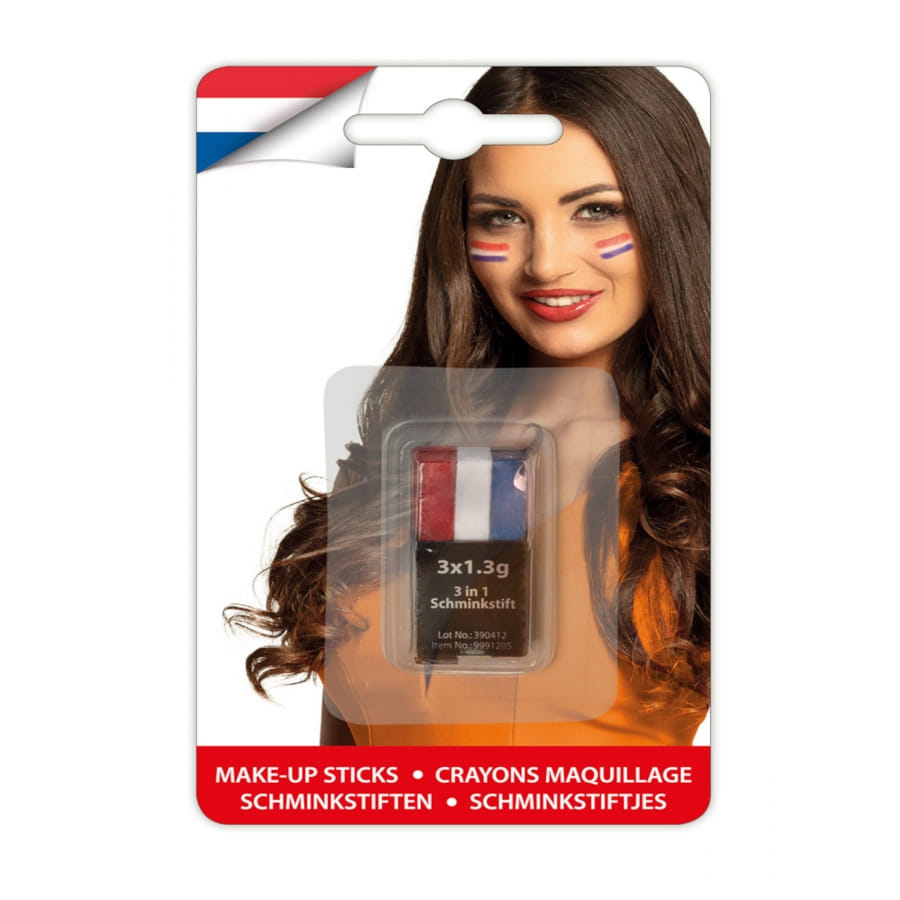 Ce stick est un crayon de maquillage qui permet en un geste, d'avoir sur le visage le drapeau aux couleurs rouge, blanc, bleu des Pays-Bas.