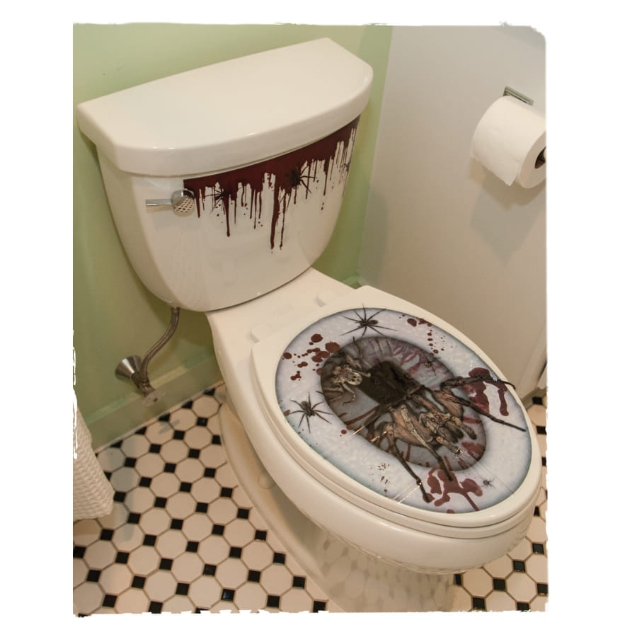 La décoration pour WC est constituée de 2 stickers autocollants imprimés d'araignées à placer sur le réservoir et l'abattant des toilettes.