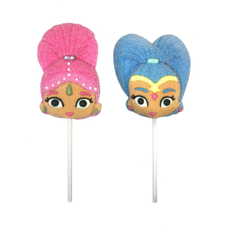 La sucette des têtes Shimmer and Shine en marshmallow fera le bonheur de petits gourmands lors d'une prochaine kermesse.