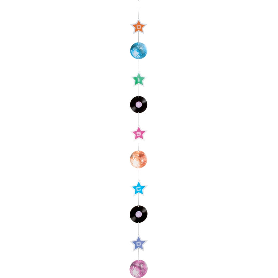 Votre talent de maître décorateur va se révéler à travers une soirée à thème années 70-80 ! Avec le décor qui convient, l'ambiance est assurée ! Cette suspension disco en carton de 185 cm de long environ est faite pour détendre l'atmosphère. Elle est formée par une succession d'éléments à thème disco aux tons colorés : étoile, boule disco, disque phonographique, etc.