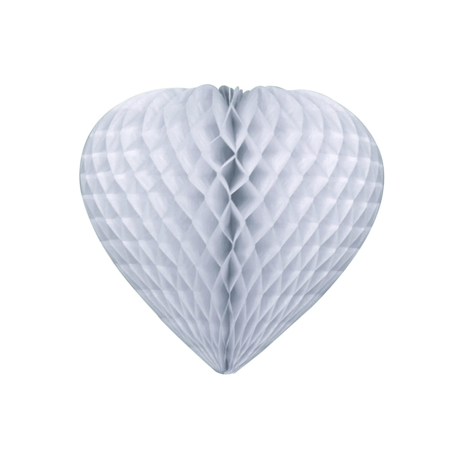 Suspension en papier alvéolé en forme de coeur de couleur blanche. Cet accessoire de décoration mesure 30 centimètres. Grâce à ce coeur, votre décoration de mariage, d'anniversaire ou de naissance sera absolument sublime.