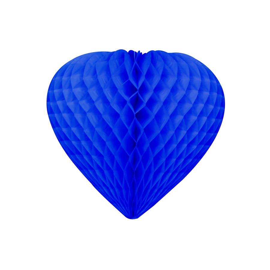 Suspension en papier alvéolé en forme de coeur de couleur bleu. Cet accessoire de décoration mesure 30 centimètres. Servez-vous de cette décoration pour créer une atmosphère douce à l'occasion d'un mariage, de la Saint Valentin ou d'un anniversaire.