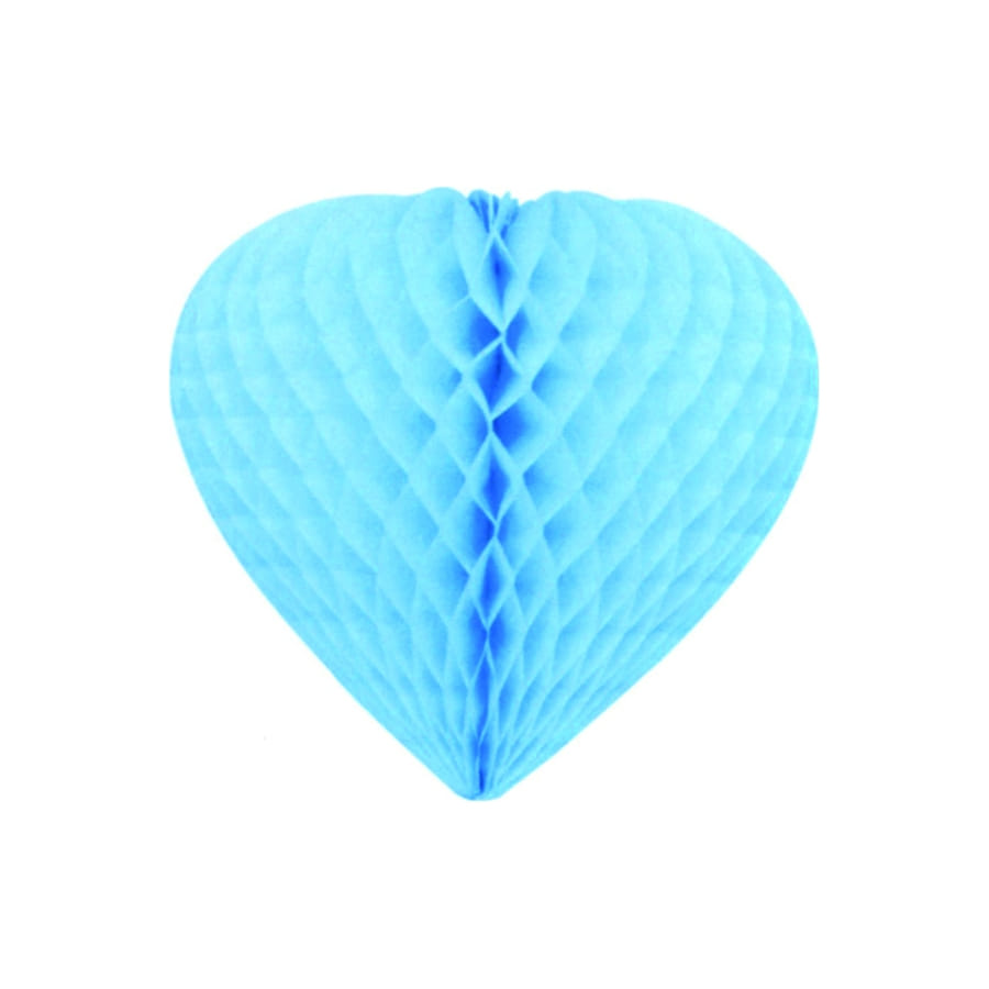 Suspension en papier alvéolé en forme de coeur de couleur ciel lagon. Cet accessoire de décoration mesure 30 centimètres. Suspendez-le n'importe où dans la pièce pour une atmosphère romantique à l'occasion de la Saint Valentin ou d'un mariage.