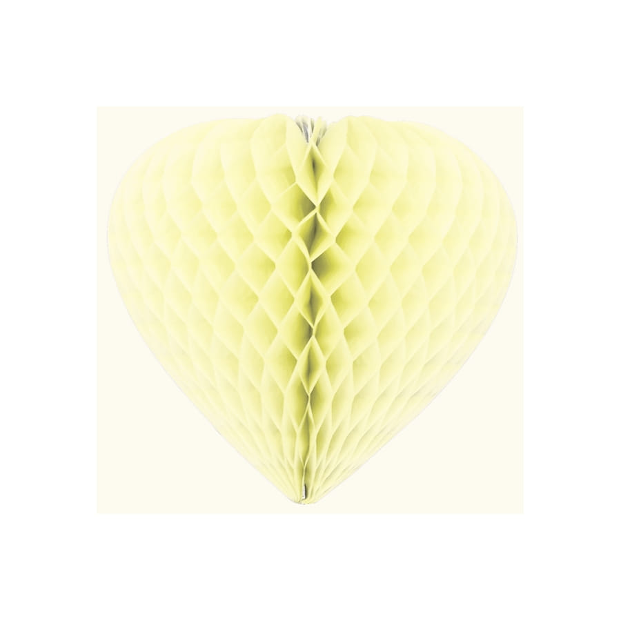 Suspension en papier alvéolé en forme de coeur de couleur ivoire. Cet accessoire de décoration mesure 30 centimètres. Grâce à ce coeur, votre décoration de mariage, d'anniversaire ou de naissance sera parfaite aux yeux de vos invités.