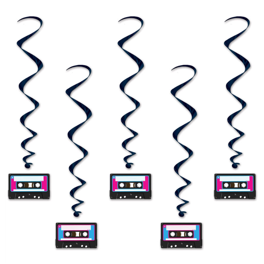 Au bout de chaque spirale est suspendue une vignette cartonnée présentant l'image d'une cassette audio.