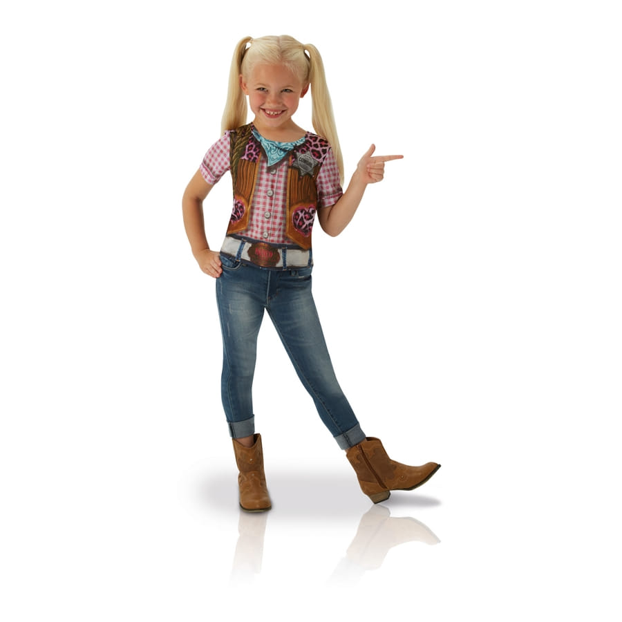 Ce T-shirt de cowgirl pour fillette photoréaliste intègre ces trois belles couleurs, à savoir : le blanc, le rouge et le marron, qui s'y harmonisent majestueusement.