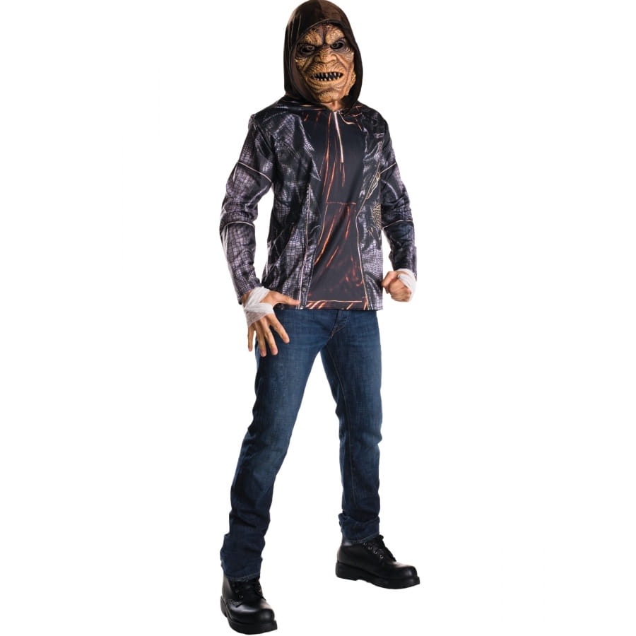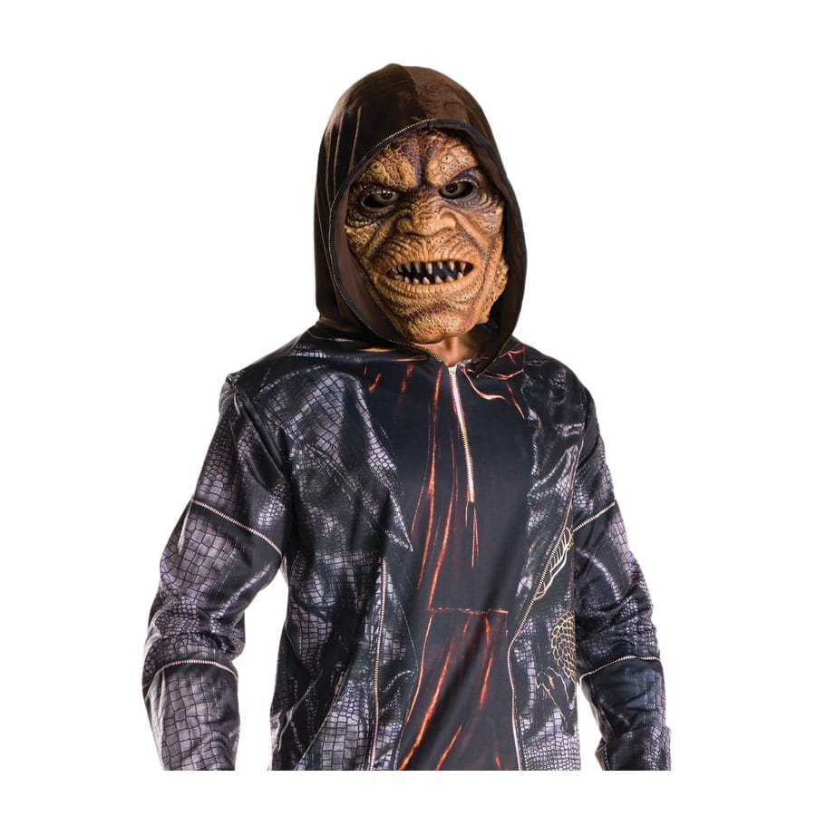 Il possède en plus une capuche marron effet velours qui recouvrira votre tête lorsque vous porterez le masque en caoutchouc représentant le visage plein d'écailles de ce monstre.
