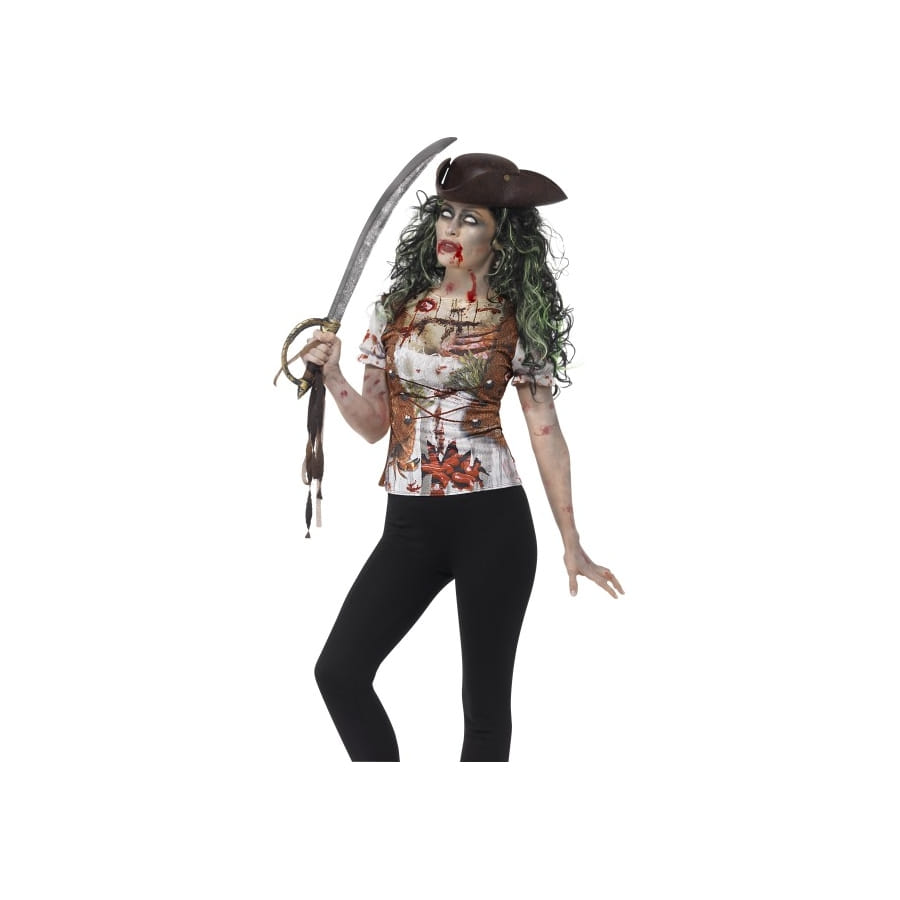 Terrorisez votre entourage avec ce T-Shirt femme imprimé pirate zombie très original ! Cet accessoire de déguisement est constitué par un tee-shirt aux manches courtes bouffantes, avec des motifs zombie pirate. Le tee-shirt possède un fond blanc parsemé de taches de sang. Cet accessoire est réservé aux femmes. Il sera parfait pour incarner une piratesse terrifiante ou un zombie le temps d'une soirée déguisée.