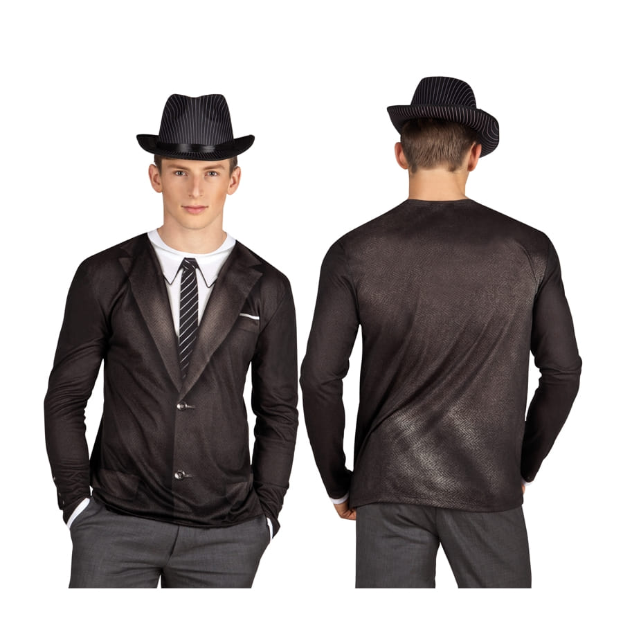 Ce T-shirt imprimé costume vintage est photoréaliste, et s'apparente entièrement au haut d'un costume. Le T-shirt est à manches longues, et est imprimé sur le devant d'une veste noire boutonnée, avec une petite pochette, un col de chemise et une cravate noire à rayures blanches. Du coup, pour rester dans le style vintage, il suffira juste de porter un pantalon, et y rajouter peut-être un chapeau et une canne parmi nos accessoires.