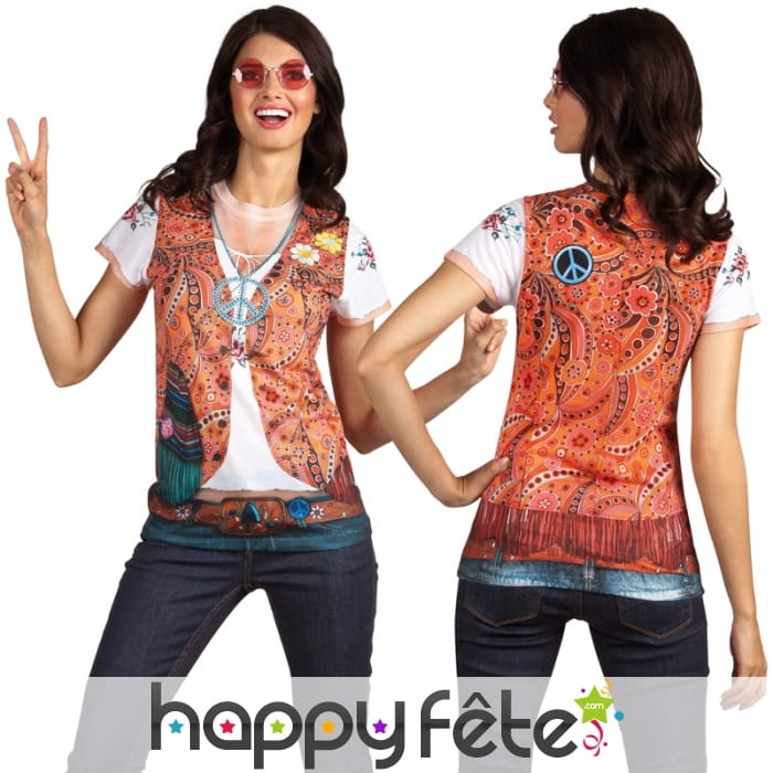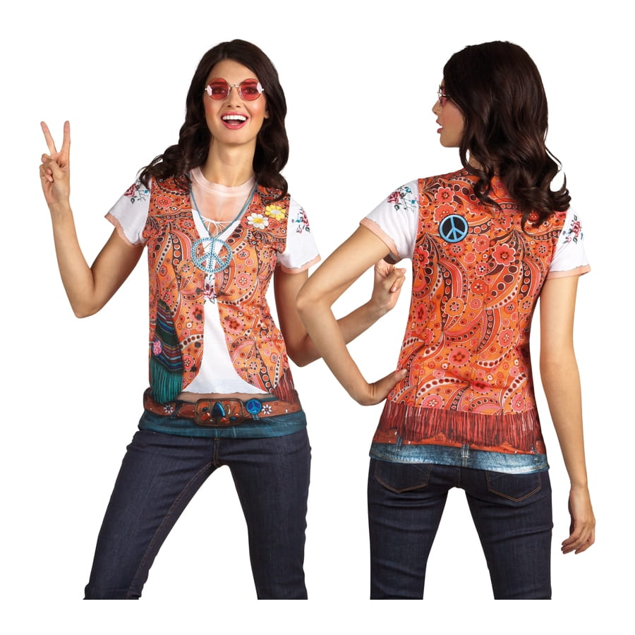 Replongez dans le monde des années 50 et 60, Mesdames, avec ce T-shirt imprimé photoréaliste gilet et pendentif hippie. Il s'agit d'un haut qui s'enfile comme un T-shirt, mais il donne l'impression de porter un T-shirt blanc avec un gilet multicolore et un pendentif Peace and Love. Rajoutez-y des lunettes ou une perruque hippie sur notre site pour encore plus de fun.