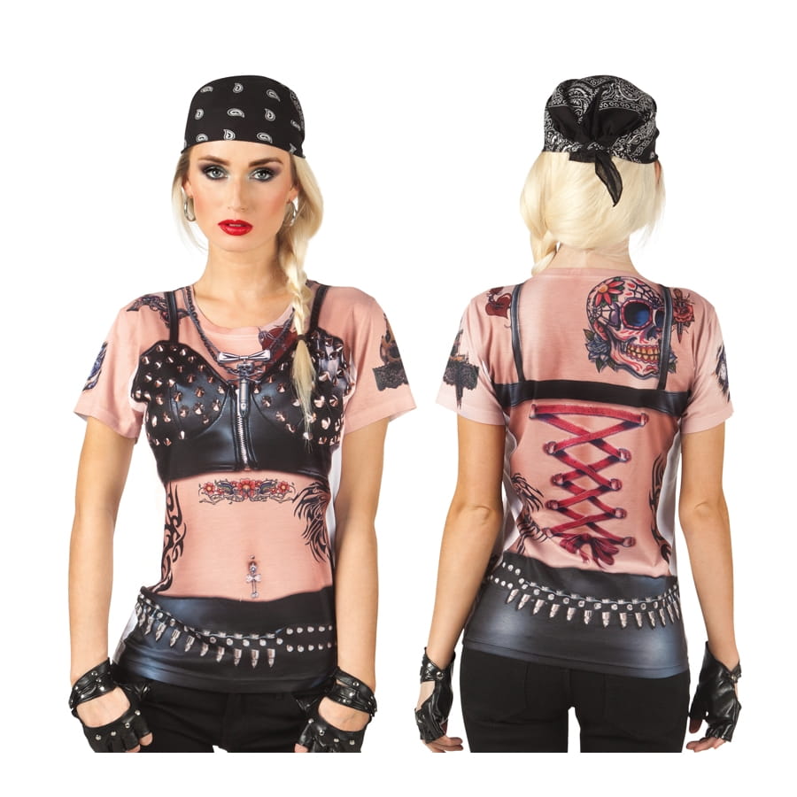 Les petits détails comptent beaucoup quand on veut s'habiller comme un biker. Saisissez une opportunité en or en vous procurant ce t-shirt imprimé lady biker sexy. Il s'agit d'un vêtement photoréaliste, de couleur noire et beige. Ce sera comme si vous portiez un haut clouté et ultra stylé. Vous aurez des tatouages ainsi qu'un piercing sur le nombril pour souligner votre cool attitude.