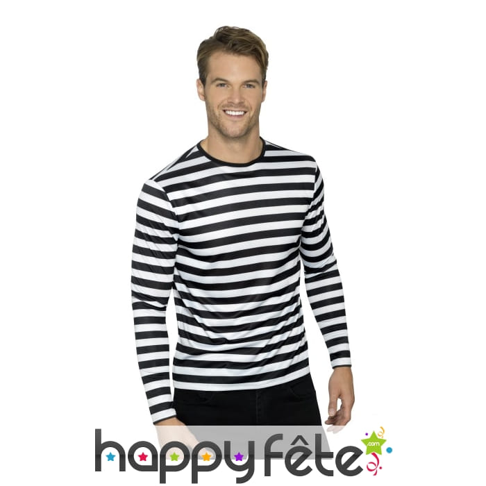 Le t-shirt à rayures peut être porté dans grand nombre d'occasions, que ce soit pour un déguisement ou pour une tenue ordinaire. Ce modèle est un t-shirt ligné noir et blanc à manches longues pour homme et femme. Avec ses rayures horizontales, ce vêtement fait immédiatement penser au marin. Dans un contexte plus insolite, vous pourrez l'utiliser pour constituer un déguisement de prisonnier.