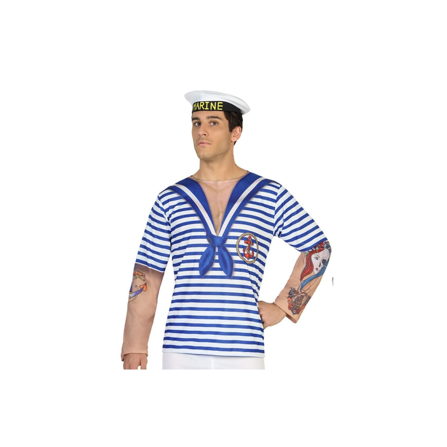 Il affiche un imprimé de la tenue officielle des matelots, un t-shirt à manches courtes à rayures blanc et bleu avec une collerette marine de couleur bleu foncé.