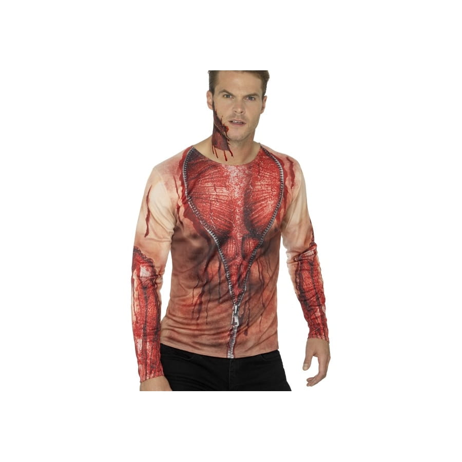 Retrouvez un accessoire pour homme digne de la fête d'halloween sur happyfete avec ce T-shirt peau déchirée, imprimé. C'est un T-shirt à manches longues avec l'image d'un torse ensanglanté dissimulé sous une fermeture éclair semi- ouverte. L'ensemble donne l'impression d'un scénario de boucherie humaine digne des plus grandes terreurs d'halloween ! Si vous en êtes adepte, commandez ce T-shirt dès maintenant.