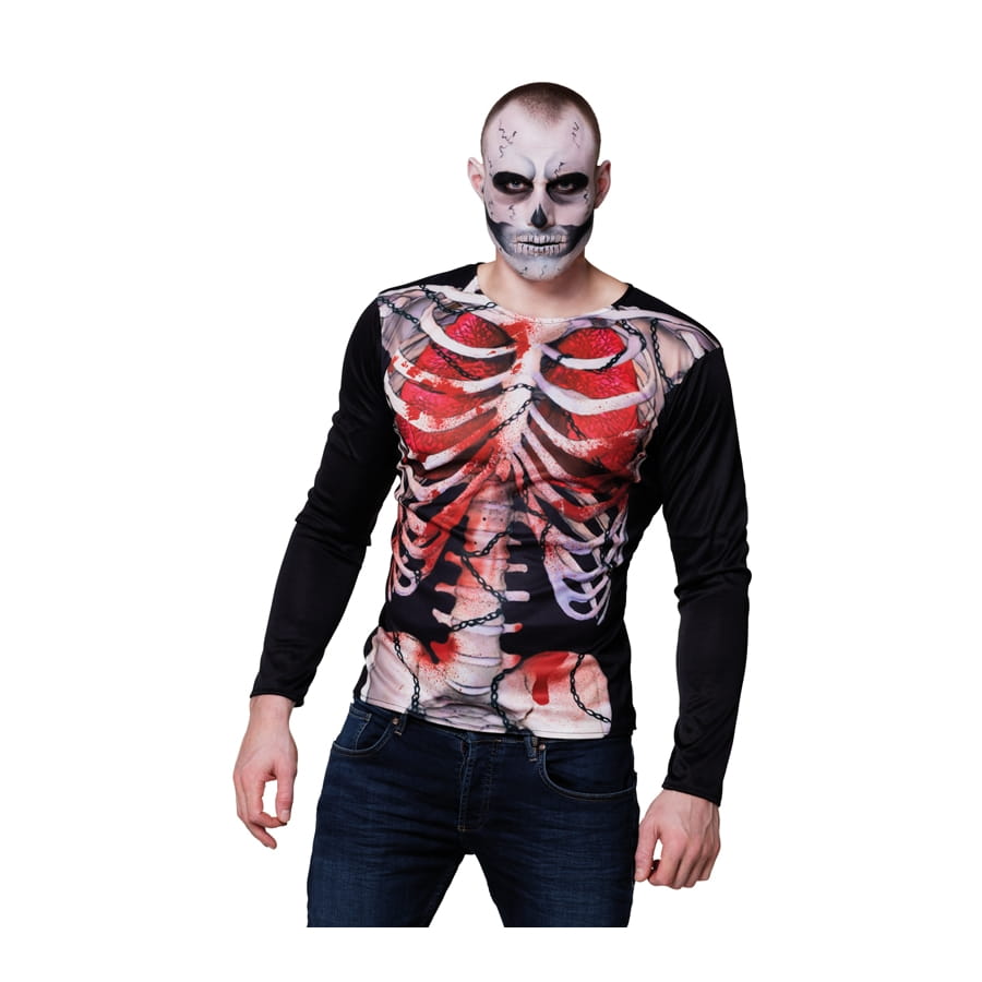 Ce body tee-shirt body ultra réaliste représente le buste d'un squelette ensanglanté et enchaîné par une chaîne noire entre les os. Proposé avec de manches longues de couleur noire, vous aurez l'air d'un personnage fictif sorti tout droit d'un film d'horreur. Ce tee-shirt squelette est l'alliance parfaite entre la sobriété et l'efficacité requise pour Halloween grâce à son imprimé en 3D. Les effets spéciaux portent à croire que vos organes sont visibles à la surface.
