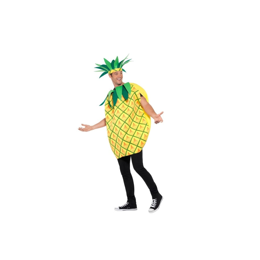 Avec son parfum délicieusement fruité et sa couleur ensoleillée, l'ananas est la star des fruits exotiques. Instaurez un petit air de vacances à votre soirée en portant ce magnifique tabard ananas. Il s'agit d'un gros tabard de couleur jaune pouvant être porté par la gent féminine et la gent masculine. Il est bien sûr dépourvu de manches et possède une forme arrondie tout comme l'ananas. Vous y retrouverez quelques touches de vert à travers des feuilles installées au niveau du col. Pour la touche finale, vous aurez droit à un bandeau en forme de couronne de feuilles. Il ne vous restera plus qu'à enfiler un pantalon et vous aurez un look des plus exotiques !
