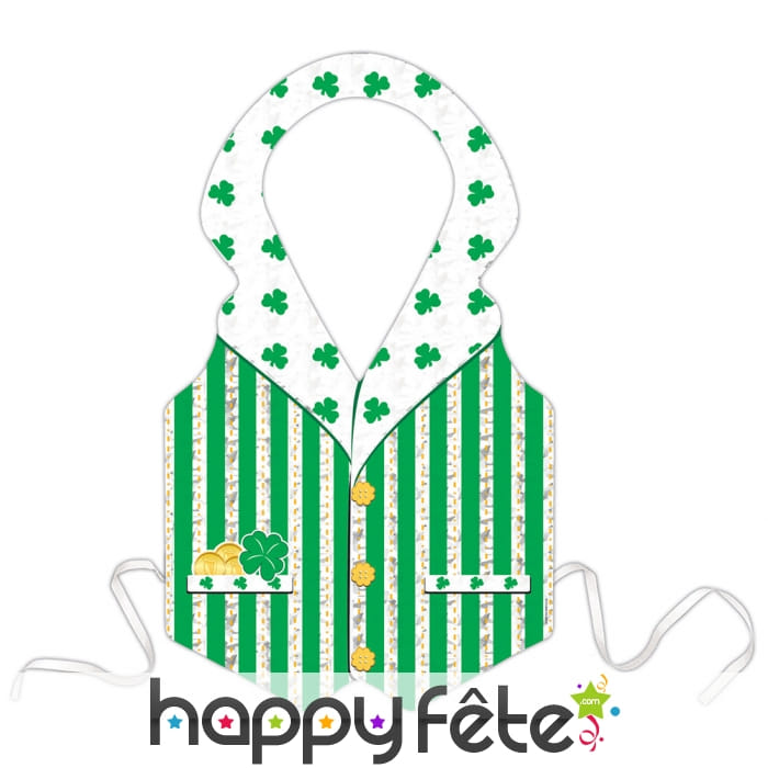 Un gilet à rayures blanches et vertes garni de pièces dorées est imprimé sur le devant.