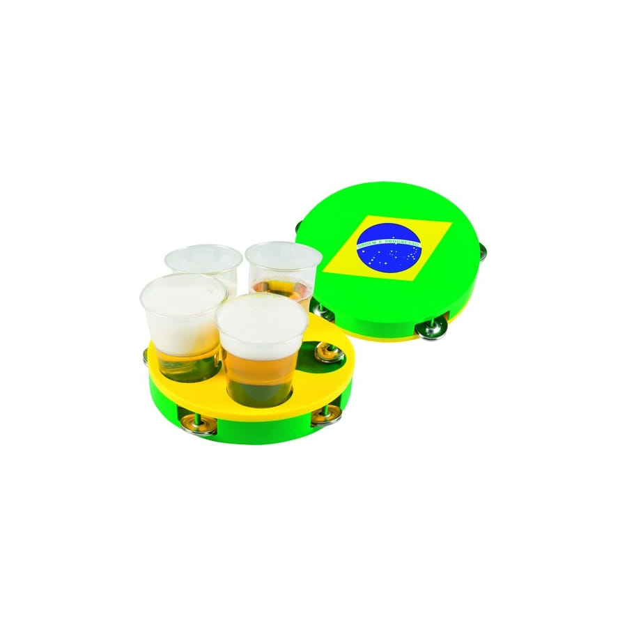 Ce tambourin à boisson aux couleurs du Brésil affiche du vert, du jaune et du bleu.