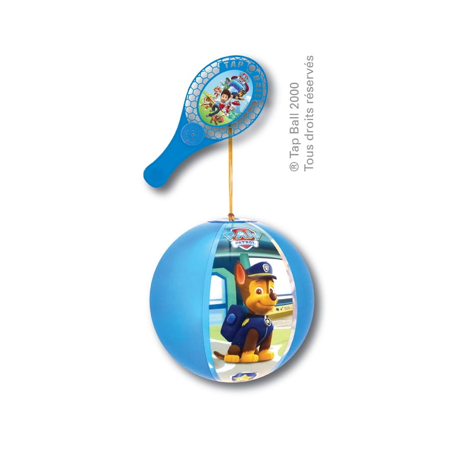 La tape balle Pat patrouille est composée d'un kit comprenant une petite raquette bleue en plastique, avec un dessin des personnages du dessin animé au milieu, et un ballon bleu gonflable imprimé du dessin de Chase, mesurant 22 cm de diamètre. Le ballon est muni d'un élastique qui est à son tour fixé à la raquette, il ne vous reste qu'à tenir la raquette et commencer à taper dans la balle pour d'infinis rebondissements.