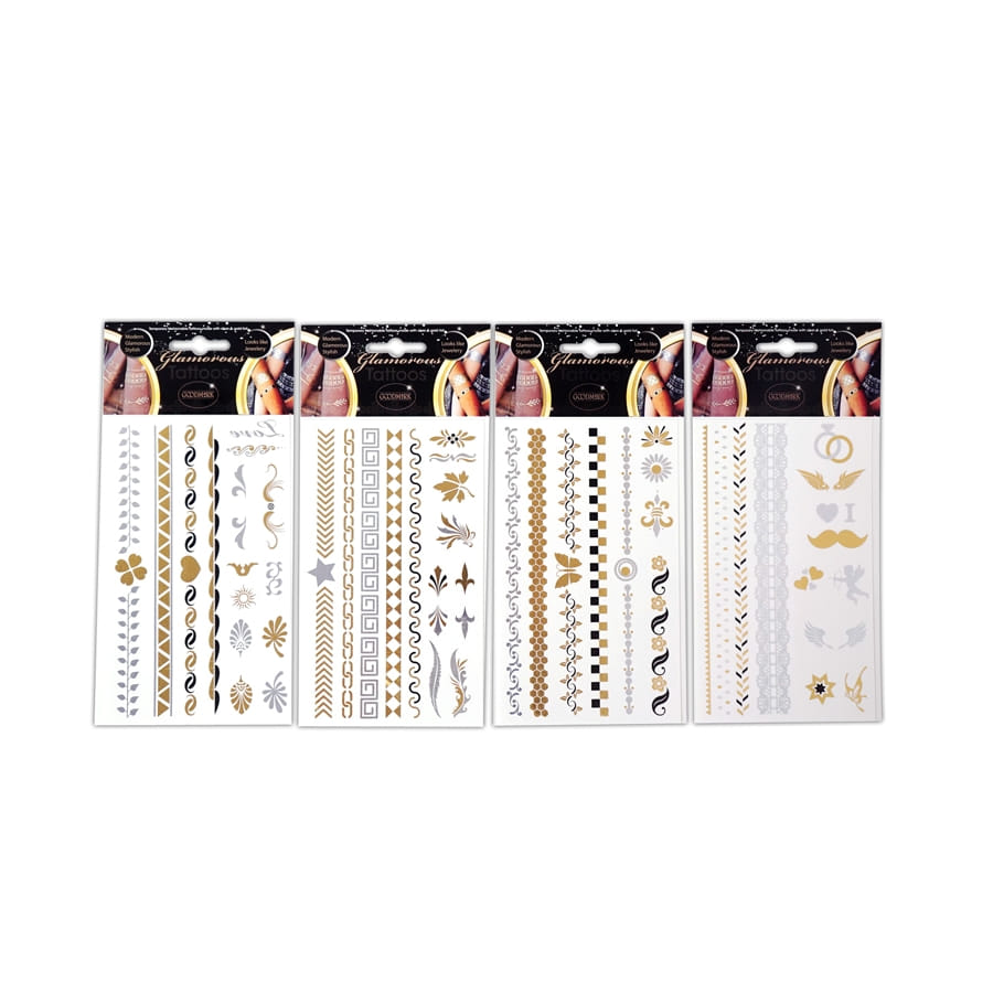 Rajoutez une touche de glamour à votre tenue avec ces tatoos fantaisies. Ils sont de couleur dorée et argentée et les motifs rehausseront votre déguisement, que ce soit au quotidien ou pour une fête en particulier. Surtout proposés pour ces demoiselles, il n'y aura pas de choix du modèle lors de la commande de ces tatoos, vous recevrez une plaquette en fonction de la disponibilité en stock.