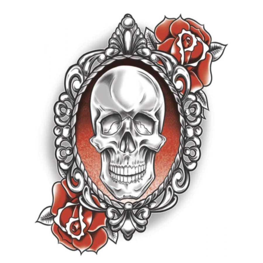 Il représente le portrait d'une tête de squelette décoré de 2 roses rouges.