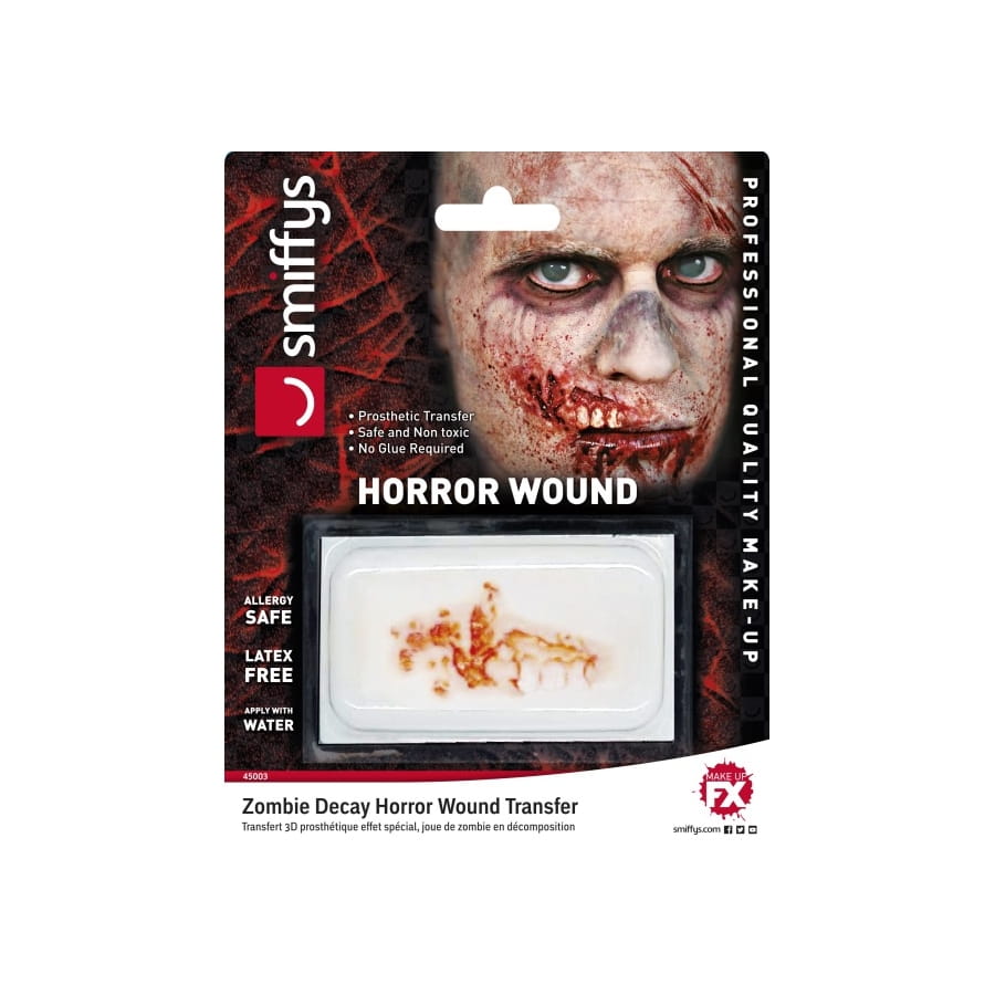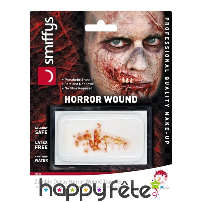 Se déguiser en zombie est à la mode pour Halloween. Il existe mille et une façons de créer l'illusion des blessures d'un mort-vivant. Expérimentez le tatouage dents et plaie ouverte pour un résultat ultra réaliste. Le tatouage représente des dents blanches tachetées de sang avec une plaie ouverte. L'article est adapté aux petits et aux grands. Il est hypoallergénique et ne contient pas de latex.