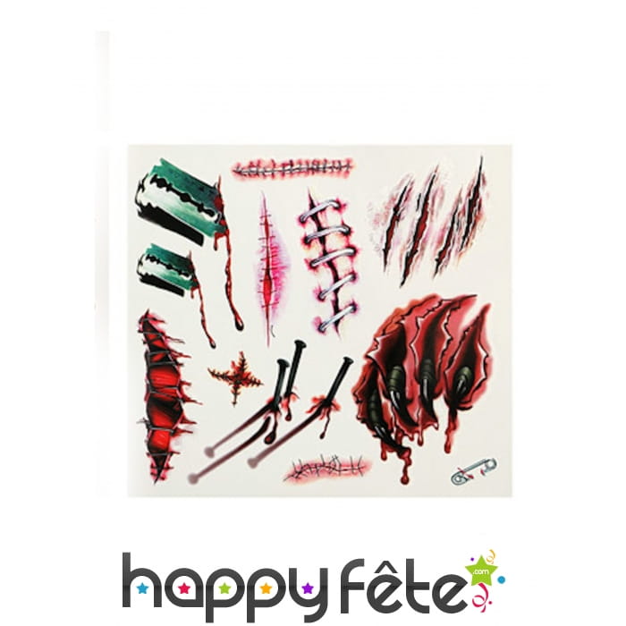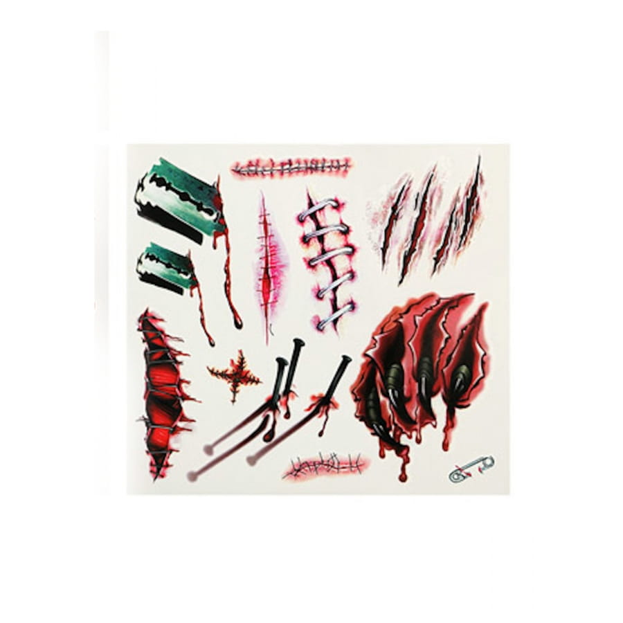 Parmi ces tatouages plus impressionnants les uns que les autres, vous trouverez des plaies et griffures ensanglantées, provoquées par des clous, des lames de rasoir, des griffes de monstres, des lames de cutters et bien d'autres terrifiantes surprises...