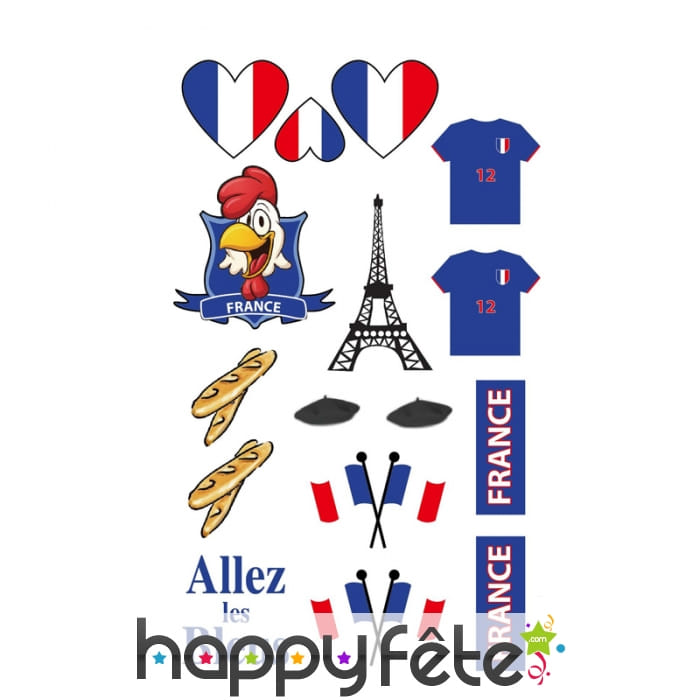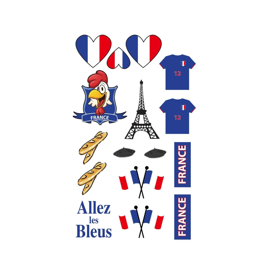 Allez les Bleus ! Cet article tatouages France bleu blanc rouge comprend une planche de tatouages mesurant 15.9 x 9.5 cm. On y trouve plusieurs motifs colorés en bleu, blanc et rouge, comme des coeurs, des tee-shirts, des baguettes de pains, des drapeaux, la Tour Eiffel, etc. Parfait pour célébrer le 14 Juillet de façon distinguée ou pour supporter une équipe sportive.