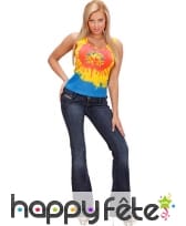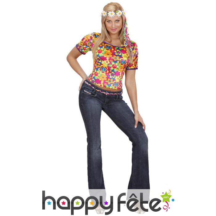 Retrouvez la tendance hippie à travers un petit haut aux couleurs éclatantes. Il s'agit du tee-shirt coloré motifs hippies, imitation velours. Le vêtement est à manches courtes. Il s'adapte à tout type de morphologie puisqu'il est de nature élastique. Vous disposerez d'un tee-shirt parsemé de motifs floraux et de symboles peace and love ultra colorés, idéal pour une soirée rétro.