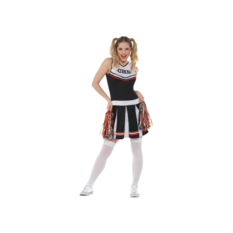 Préparez d'ores et déjà votre chorégraphie car vous allez débarquer à une soirée déguisée dans la peau d'une pom pom girl. Endossez fièrement le rôle de la fille la plus populaire du lycée dans cette tenue adulte de pom pom girl noire et blanche. Elle est formée par une mini robe dépourvue de manches. En haut, le vêtement est près du corps mais à partir de la taille, il est légèrement évasé. Il s'agit d'une magnifique robe de couleur noire et blanche, agrémentée de fines bandes rouges au niveau de la poitrine et sur le bas du vêtement. Vous disposerez bien évidemment d'une paire de pom poms de couleur rouge, noire et blanche, pour compléter votre déguisement.