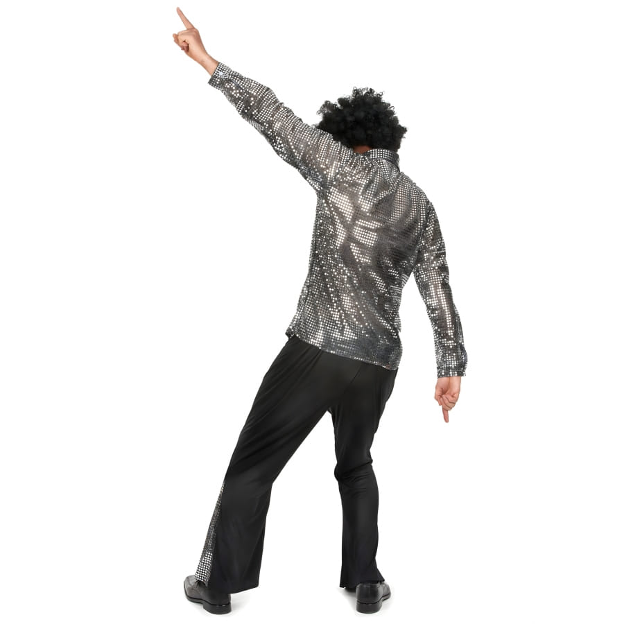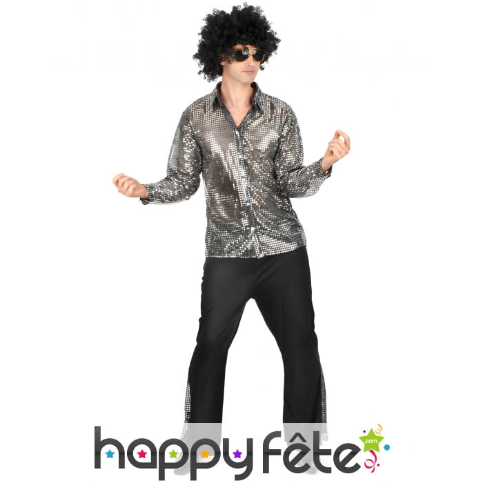 Commençons par le haut: la chemise. Noire comme la nuit, cette chemise en tissu est entièrement recouverte de sequins argentés. Quand vous bougez, ces petites paillettes scintillent et captent la lumière, vous transformant en véritable boule à facettes ambulante!