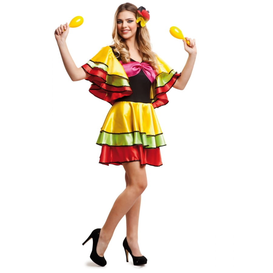 Trémoussez-vous au rythme de la samba avec cette Tenue colorée à volants courte danseuse de samba.