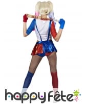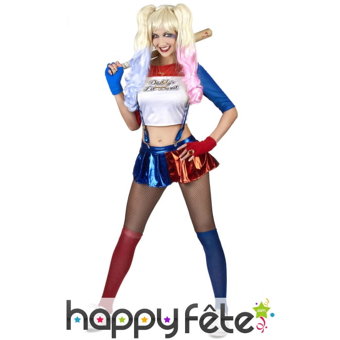 Un haut bleu blanc rouge asymétrique (plus long à l'arrière qu'à l'avant) floqué de l'inscription Daddy's lil devil en noir. Une arlaquinn toute en couleur!