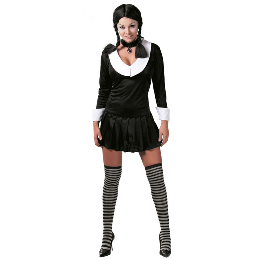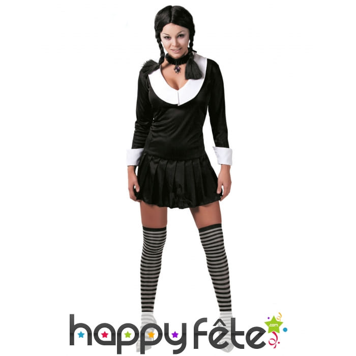 Déguisez-vous en une écolière pleine de charme, en revêtant cette tenue courte de Mercredi Addams sexy pour femme.