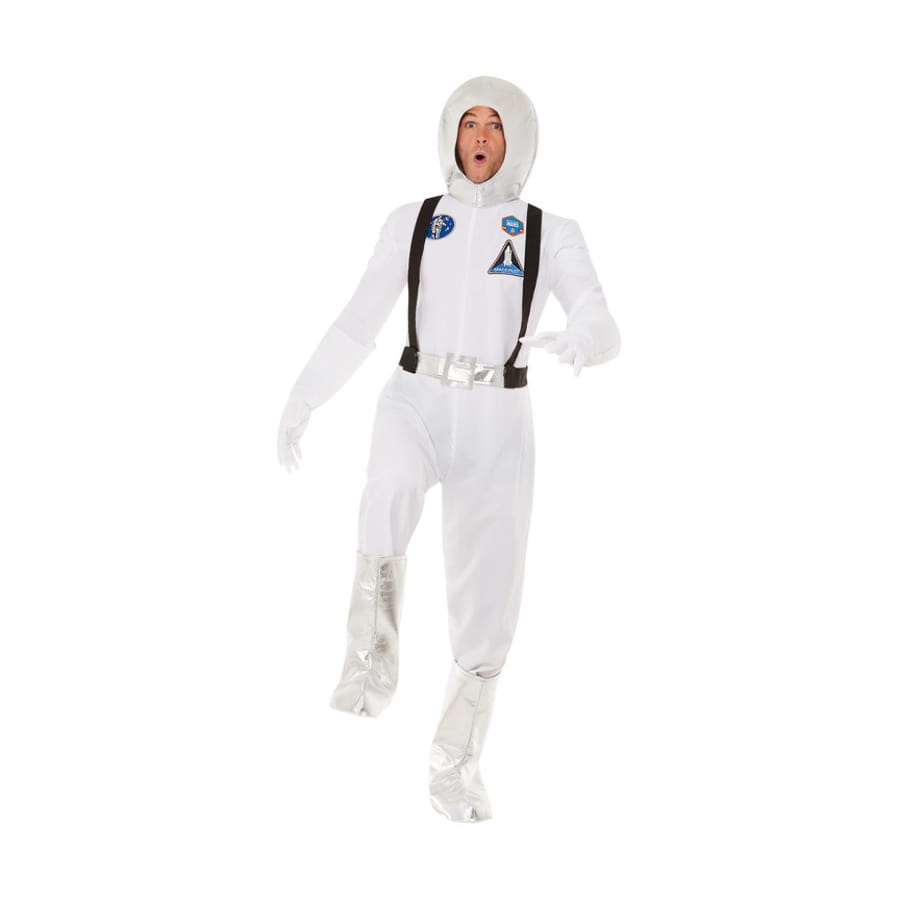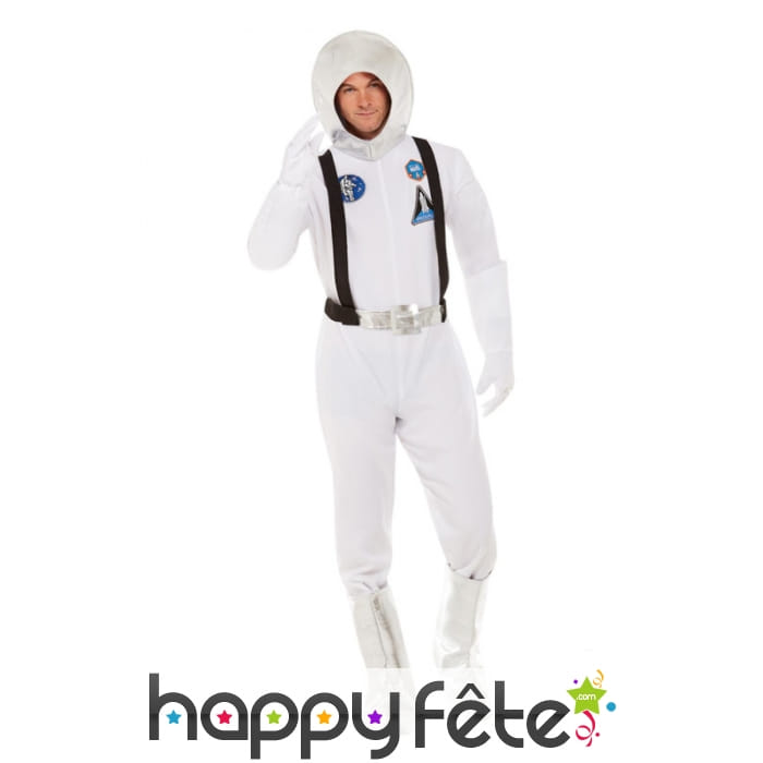 Pour accompagner cette combinaison, une paire de gants blancs est fourni, ainsi que des couvre-bottes effet métallique et un casque d'astronaute.