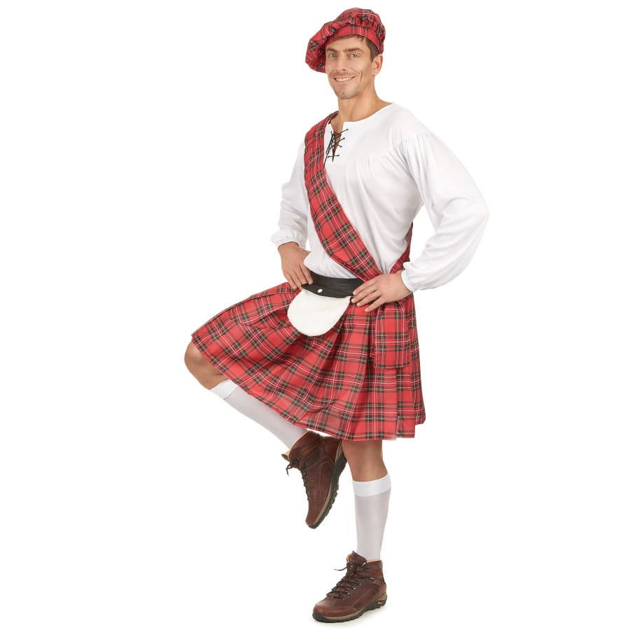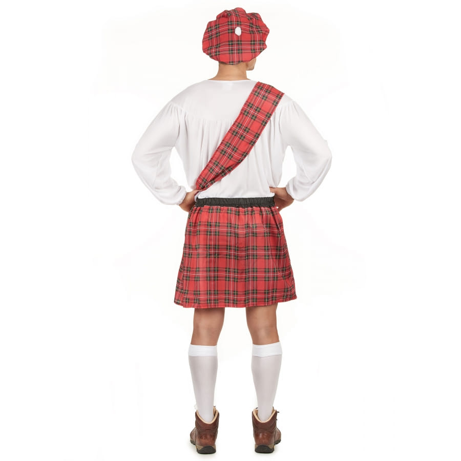 Pour l'une de vos soirées déguisées, essayez cette tenue d'écossais pour homme adulte. Elle est constituée d'un chemisier blanc à encolure tunisienne à oeillets, fermée par un lacet noir. Celui-ci est à manches longues en ballon resserrées aux poignets, et est fait d'un tissu léger et fluide. Nous avons ensuite la jupe ou le kilt typique de la tenue, à carreaux rouges, élastique à la taille et allant à hauteur des genoux, avec une fausse poche en noir et blanc cousue à sa taille. Enfin, un béret et une écharpe assortis au kilt finaliseront le déguisement, l'écharpe se portera en diagonale puis se nouera sur le bas-côté. Le port de longues chaussettes rendra le tout encore plus original.