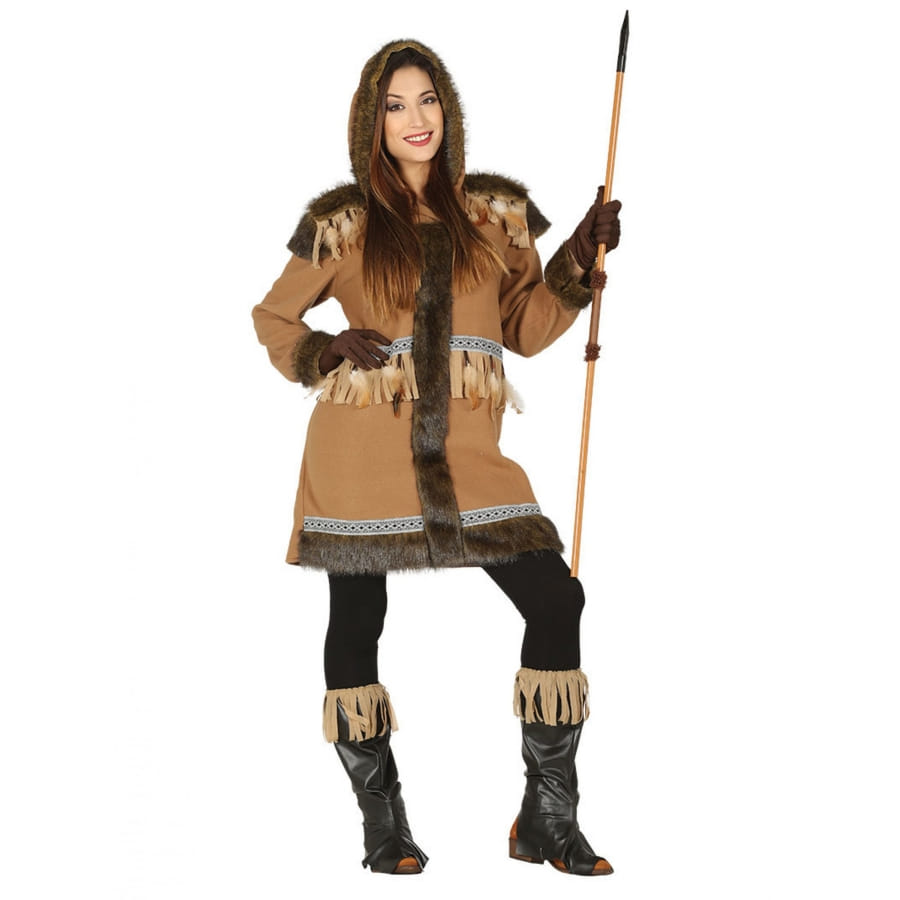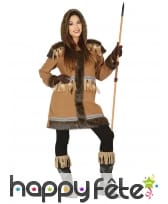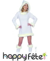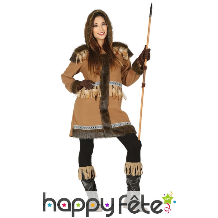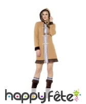 Pour finir, une capuche est cousue directement à l'encolure et possède également une bande de fourrure factice à l'avant pour imiter à merveille la tenue porté par les femmes esquimaux.