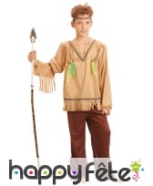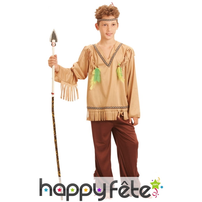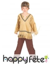 Quel petit garçon ne rêve pas de jouer aux petits Iroquois ou Apaches ? Fournissez-leur le costume adéquat avec cette tenue d'indien traditionnel marron pour enfant, pour qu'ils puissent s'y donner à coeur joie. Ce déguisement complet comporte une tunique marron clair pour le haut, assez long et terminé par des franges en bas, qui sont aussi reprises au niveau des manches et des épaules. A la taille et sur le contour du col, on retrouve des liserés ornés de motifs tribaux, motifs qui décorent également le bandeau élastique à porter autour de la tête. Le pantalon, quant à lui, est de couleur marron foncé, retenu par un élastique à la taille, et avec des franges sur les mollets. Vous pouvez décorer le tout avec des petites plumes et une arme d'indien, non fournis ici.