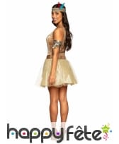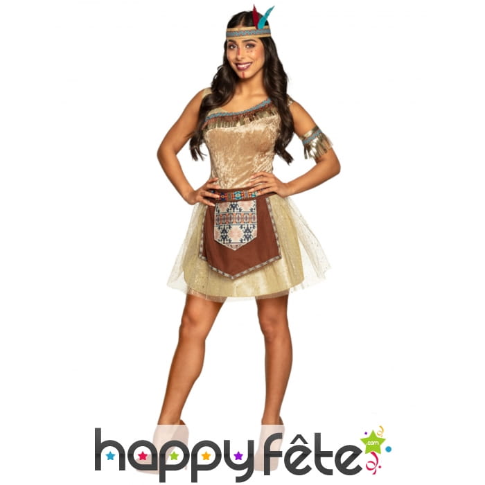 La jupe est recouverte de tulle transparent. Quant au brassard, il habillera votre bras et renforcera le côté réaliste de la tenue d'indienne. Il est doré, brillant et frangé, avec des décorations rappelant des motifs tribaux typés indiens.
