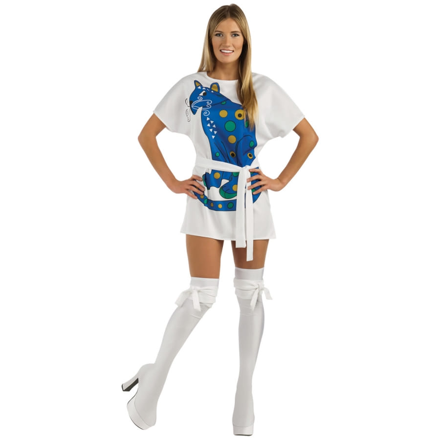 Une soirée déguisée en vue, Mesdames ? Craquez pour cette tenue de Agnetha, Abba, pour représenter votre chanteuse favorite le temps d'une soirée. Elle est constituée d'une tunique blanche à col rond, à manches raglan, allant jusqu'à mi-cuisse, imprimée d'une panthère bleu avec des motifs colorés sur le devant. Une ceinture blanche cintre la tunique à la taille, elle se noue sur le devant. Une paire de sur-bottes de couleur blanche constitue le dernier élément de la tenue. Elle donne un effet cuissarde en moulant les membres inférieurs jusqu'au-dessus des genoux où des petites lanières blanches vous permettront de faire des noeuds. Si vous n'avez pas de longs cheveux, choisissez une belle perruque blonde sur notre site.