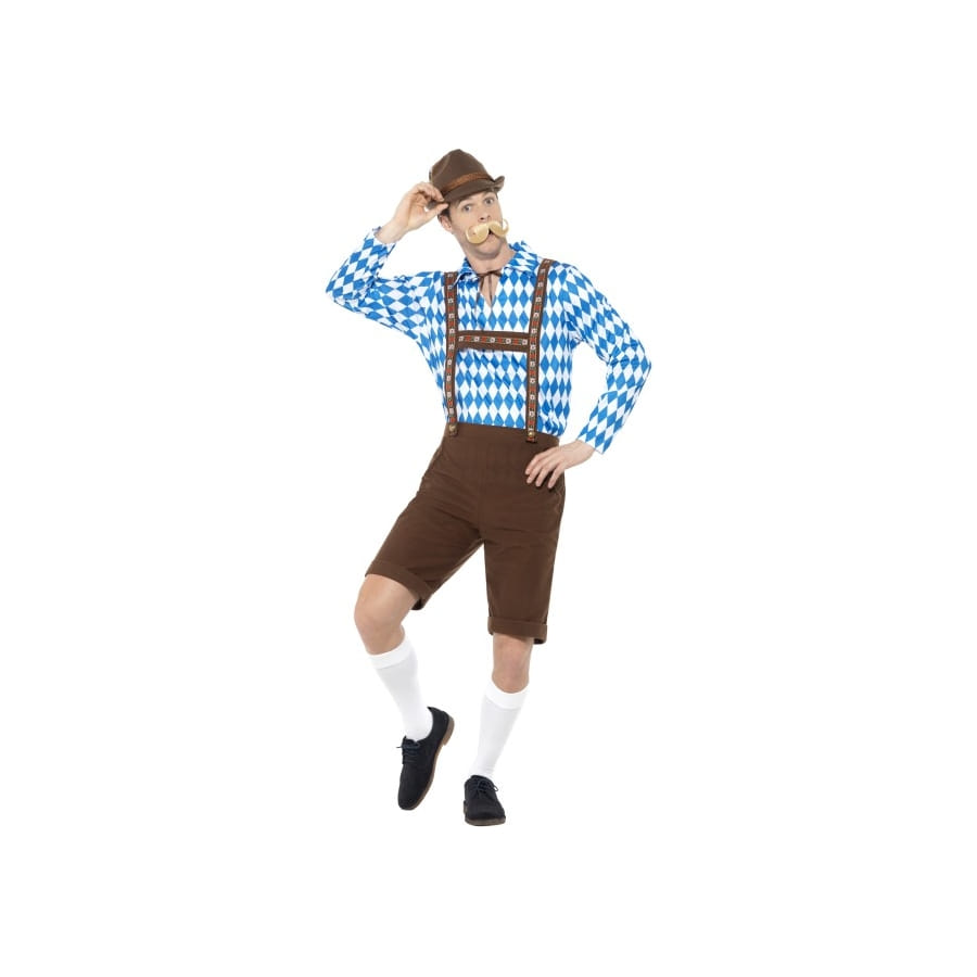 Imprégnez-vous d'une nouvelle culture en adoptant le style vestimentaire typique d'un bavarois. Cette tenue de Bavarois marron Oktoberfest est spécialement prévue pour la gent masculine. Elle est constituée par une salopette short de couleur marron uni avec des bretelles à motifs. Elle comporte également une chemise à manches longues, de couleur bleue et blanche répartis à travers des motifs losange. Vous pourrez faire un petit noeud sur le devant grâce à une ficelle disposée au niveau du cou. La célébration de la fête de la bière sera très spéciale grâce à ce déguisement. Pour un look infaillible, agrémentez votre tenue de quelques accessoires inspirés de La Bavière, à commander sur happyfete : chapeau, moustache, paire de faux bas, etc.
