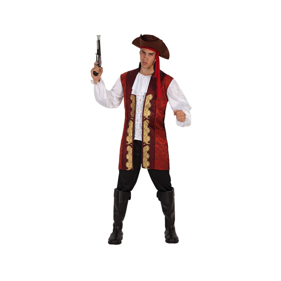 Messieurs, incarnez un vrai pirate le temps de la fête des morts. Pour ce faire, optez pour un costume à la fois classe et original. Un tel article reste disponible sur notre site. En effet, il s'agit de la tenue de capitaine pirate rouge brodé. Elle se compose d'une chemise à manches longues de couleur blanche. Elle se trouve pourvue d'élastique au niveau des extrémités des manches et d'un jabot au niveau du col. Ce déguisement compte aussi une veste jouant avec les couleurs rouge vif, bordeaux et dorée, pour un rendu très distingué. Un pantalon noir à élastique s'ajoute à cette tenue, ainsi qu'un chapeau en feutrine noire, décoré d'un ruban rouge.