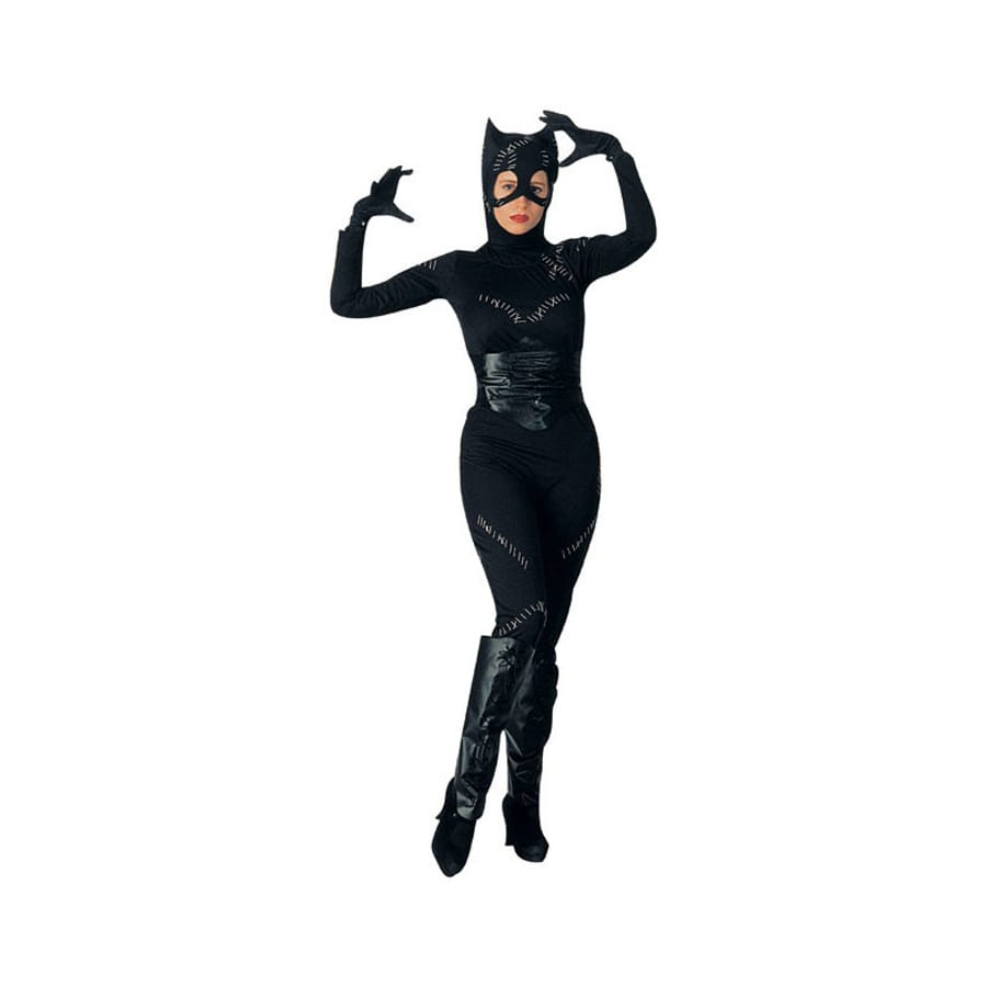 Revêtez l'apparence de Catwoman lors d'une soirée déguisée. Vous deviendrez alors une charmante cambrioleuse dans cette tenue de Catwoman pour femme. Le déguisement vous propose une combinaison près du corps de couleur noire. Les manches sont longues et des traces de griffures ont été imprimées par ci par là. A cette combinaison s'ajoute une paire de surbottes en vinyl de couleur noire, à porter de préférence avec des bottes. Une ceinture de couleur noire, assortie aux surbottes est aussi fournie pour sublimer votre taille. Et enfin, pour incarner la belle Catwoman dans les règles, vous aurez à enfiler son masque de chat, de couleur noire. Le masque est également agrémenté de griffures. Dans l'ensemble, cette tenue sous licence Catwoman fera de vous une séduisante super héroïne !