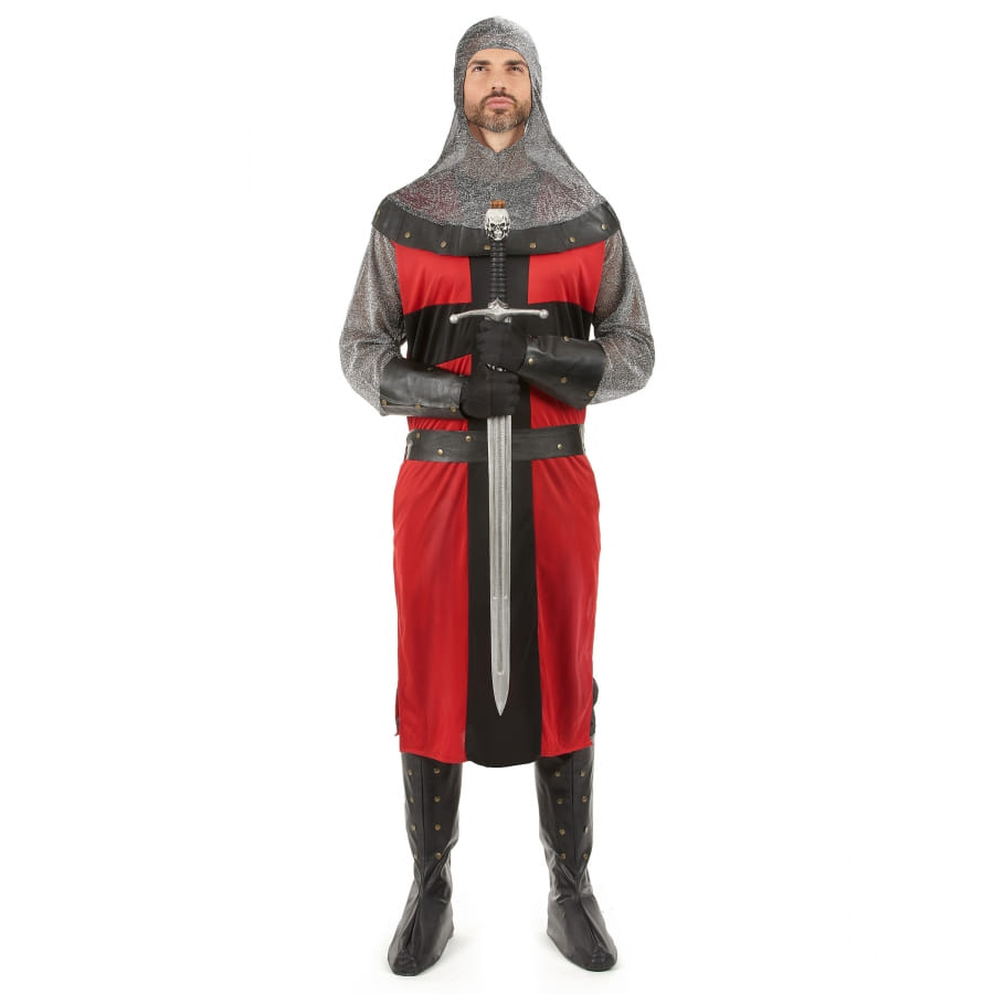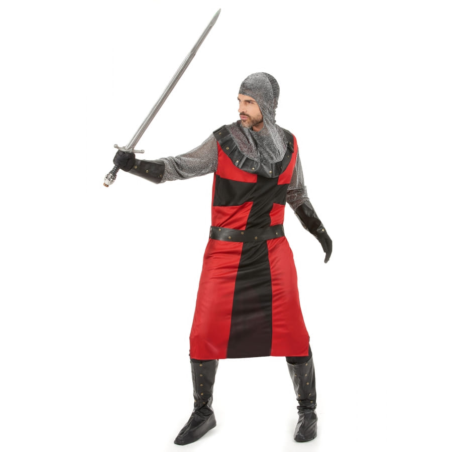 Vivez l'époque pleine d'action et d'aventure du Moyen-Age avec cette tenue de chevalier médiéval en cotte de maille. Destiné à la gent masculine, ce déguisement se compose d'une tunique rouge et noire avec de longues manches qui imitent la cotte de maille, d'un casque qui est également en imitation cotte de maille, d'une ceinture imitation cuir noir avec des pressions métallisées, de bracelets et de couvre-bottes noires en imitation cuir incorporés de pressions métallisées. Ces dernières permettent d'accentuer le réalisme de l'ensemble. Avec ce costume, vous pourrez jouer le rôle d'un véritable guerrier médiéval, surtout avec une épée, que vous pourrez vous procurer parmi nos accessoires.